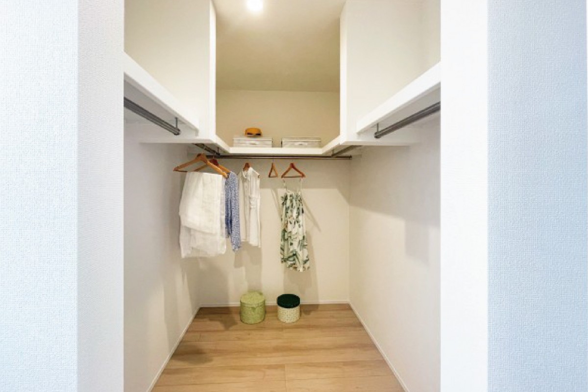 ハンガーパイプと収納棚を備えた4帖のウォークインクローゼット。