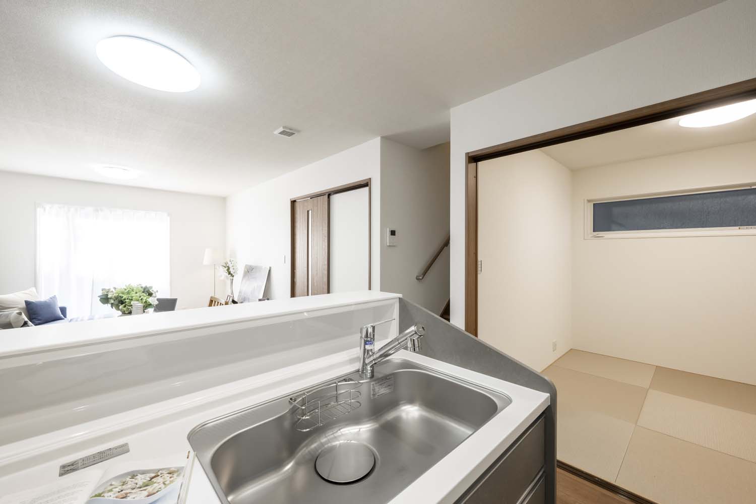 爽やかな空のもと、プライベートテラスで過ごす親子のひととき。 朝の身支度や家事がスムーズにこなせる動線と、成長に合わせて使い方が広がる洋室。 家族の毎日に、心地よさとゆとりを届ける住まいです。 穏やかな開放感に包まれながら、笑顔あふれる暮らしがはじまります。