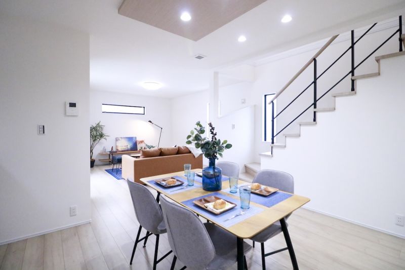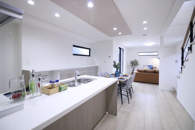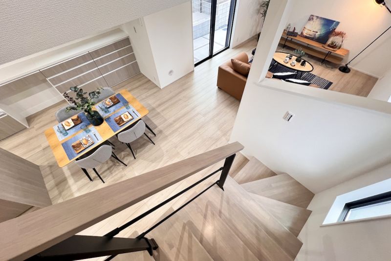 LDKを見渡し、2階への階段にも気を配れるキッチン。家族みんなが使いやすく、料理をしながらもキッチンを中心に会話が弾みそう。※現地内観