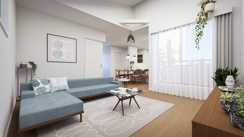 リビング:落ち着きのあるブラウン系のフローリングを採用しており、家具を選びません。風通しの良いプランです。※内観パース