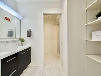 ◇洗面室にはリネン庫を備えました。洗剤類のストックや着替えやタオルを置いて帰宅すると手を洗いお部屋に行く清潔な習慣が身に付きます。