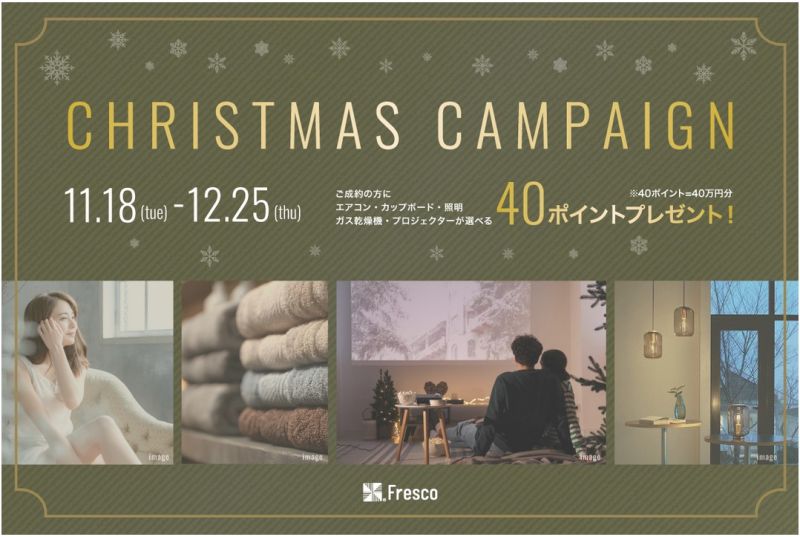 2025年11月18日(火)~クリスマスキャンペーン 選べる40ポイント(40万円)をプレゼント! 【プレゼント商品】 ・カップボード ・照明 ・エアコン ・リファ等