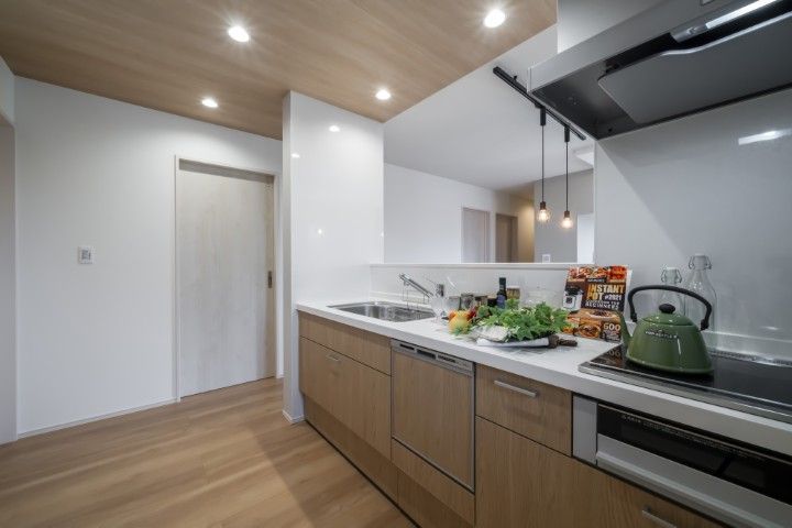キッチンはご夫婦で一緒に料理をしたり、お子様がお手伝いをするのにもゆとりのある広さです。パントリーなど収納も充実しています。※現地内観