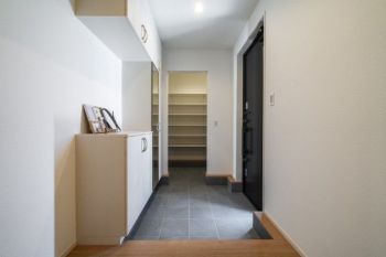 広々としたシューズクロークを完備した玄関ホール。帰宅後すぐにベビーカーなど大きな物が収納でき、お出かけする際にすぐに利用できます。いつでも片付いた空間が保てやすいですね。 ※現地内観