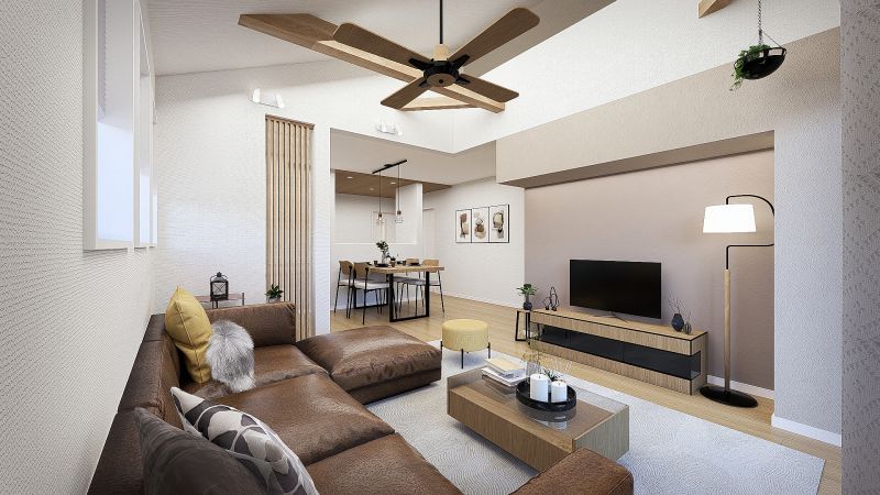 ダイニング・落ち着きのあるブラウン系のフローリングを採用しており、家具を選びません。3面採光で風通しの良いプランです。 ※内観パース