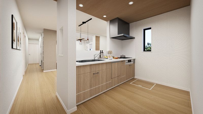 キッチンからリビングまで見渡すことができるので、家事をしながらリビングで過ごす子供たちやペットの様子を伺うことができます。 ※内観完成予想図