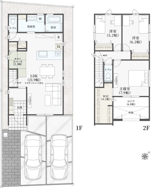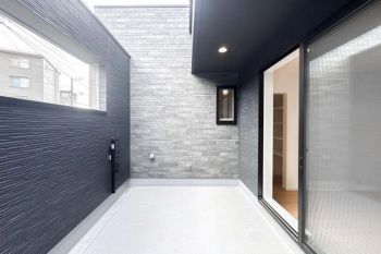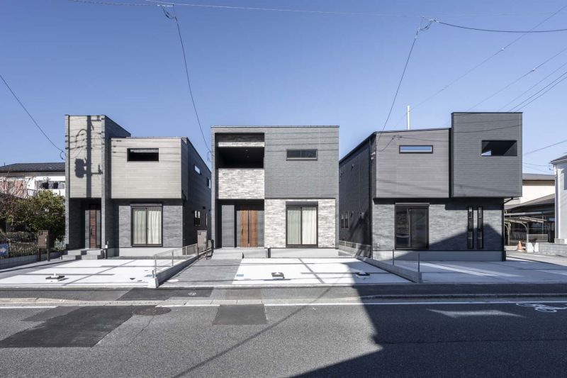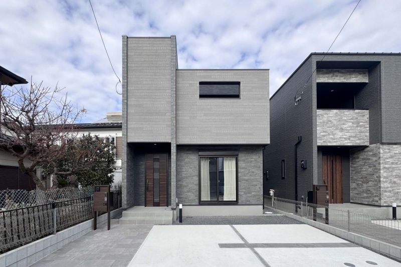 【5号棟外観写真】 ◇ゆったり駐車スペース2台 ◇洗練された素材使いと都会的な佇まいが、街並みに上質な雰囲気を添えます。