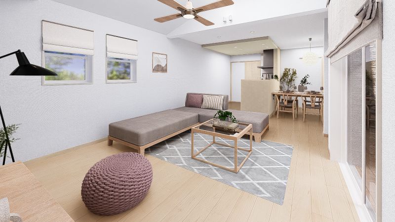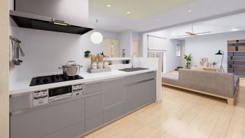 ◇キッチンからリビングまで見渡すことができるので、家事をしながらリビングで過ごす子供たちやペットの様子を伺うことができます。 ※内観完成予想図