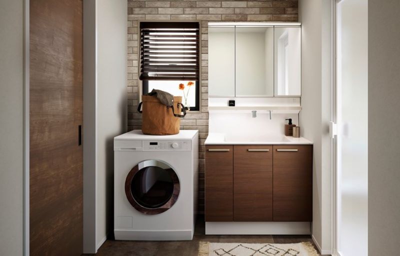 ◇洗面室からバルコニーへ直結する動線で、洗たくの一連の作業を最短ルートで完了。さらに、洗面室には物干しユニットを後付けできる天井下地を備え、昼夜問わず洗たくが可能です。