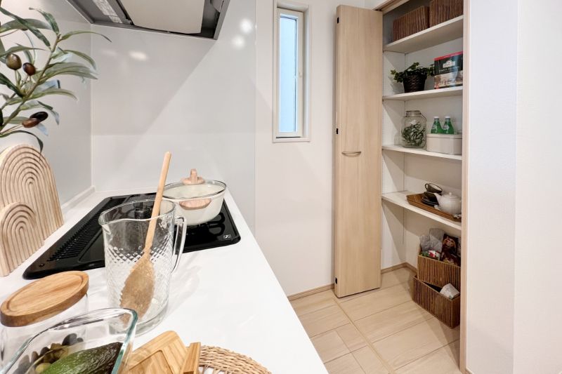 ◇食品ストックや調味料を収納できるパントリーは人気の高い設備の一つです。キッチンの近くに設計することで、家事の効率化を叶えます。※施工事例