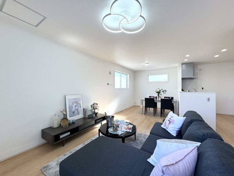 ◇家具の配置がしやすい長方形のリビングが魅力。ダイニングとの一体感を保ちつつ、自然と家族が集まるくつろぎの空間です◎
