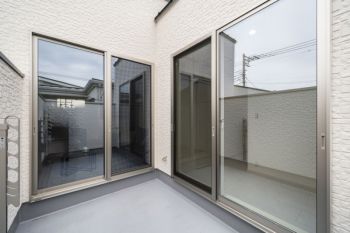 ◇洗面室とリビングの両方からアクセスできる便利なバルコニー。視線が抜けることで室内にも開放感が生まれます。洗たくだけでなく、植物を育てたりと、おうち時間を豊かにするスペースです。