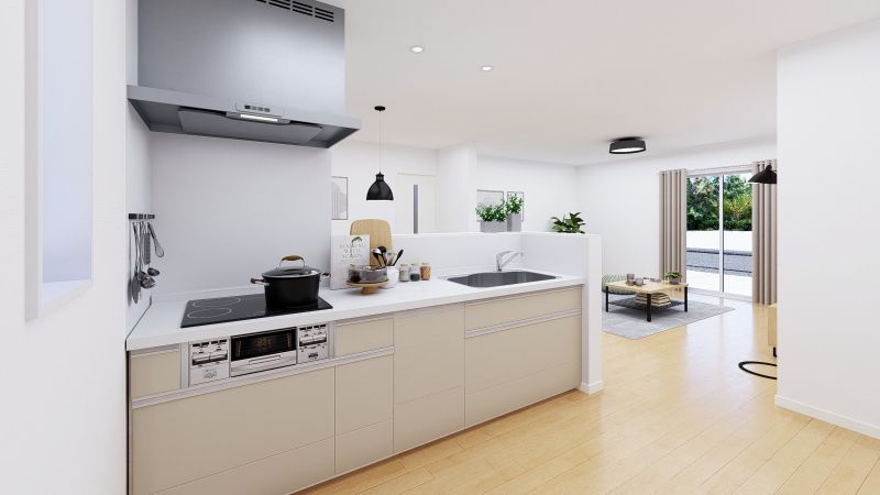 リビングへ、庭へ視線が広がりながら、落ち着いて作業ができる機能的なキッチン。大容量の収納で、空間はいつでもすっきり。※完成予想図