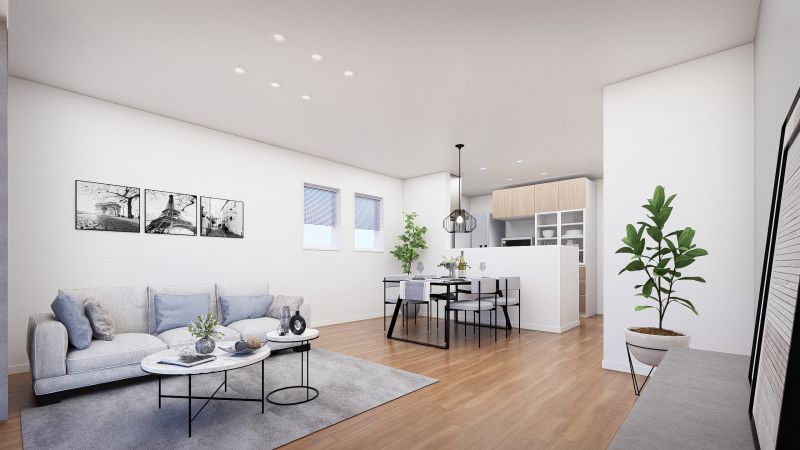 ◇キッチンからリビングやダイニングを見渡せる間取りで、家事をしながら家族の様子を見守れます。小さなお子さまがいるご家庭にも安心の設計です♪【完成予想パース】