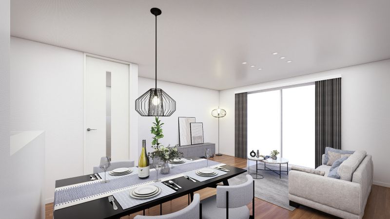 ◇大きな窓からやさしい自然光が差し込むダイニングは、明るく開放感のある空間。朝の食事や家族との会話がより一層心地よく感じられます♪【完成予想パース】