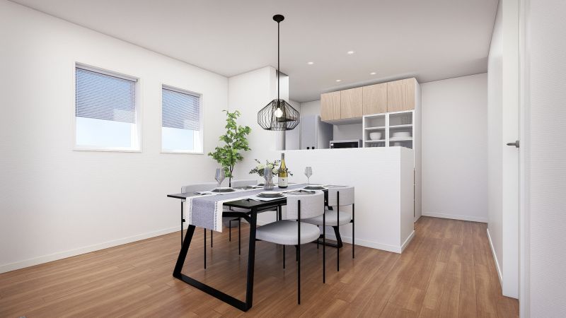 ◇キッチンからダイニングを見渡せる間取りで、家事をしながら家族の様子を見守れます。小さなお子さまがいるご家庭にも安心の設計です♪【完成予想パース】