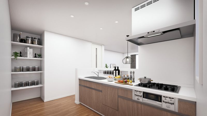 ◇食品ストックや調味料を収納できるパントリーは人気の高い設備の一つです。キッチンの近くに設計することで、家事の効率化を叶えます◎【完成予想パース】