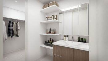 ◇洗面室とWICが直結し、朝の身支度から収納まで快適。生活動線に配慮した間取りです◎【完成予想パース】