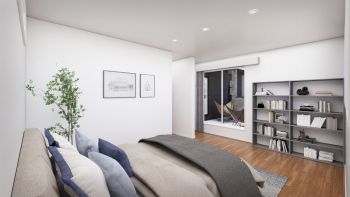 ◇主寝室からインナーバルコニーへ直接アクセス可能。朝の光と風を感じながら、心地よいひとときをお過ごしいただけます♪【完成予想パース】