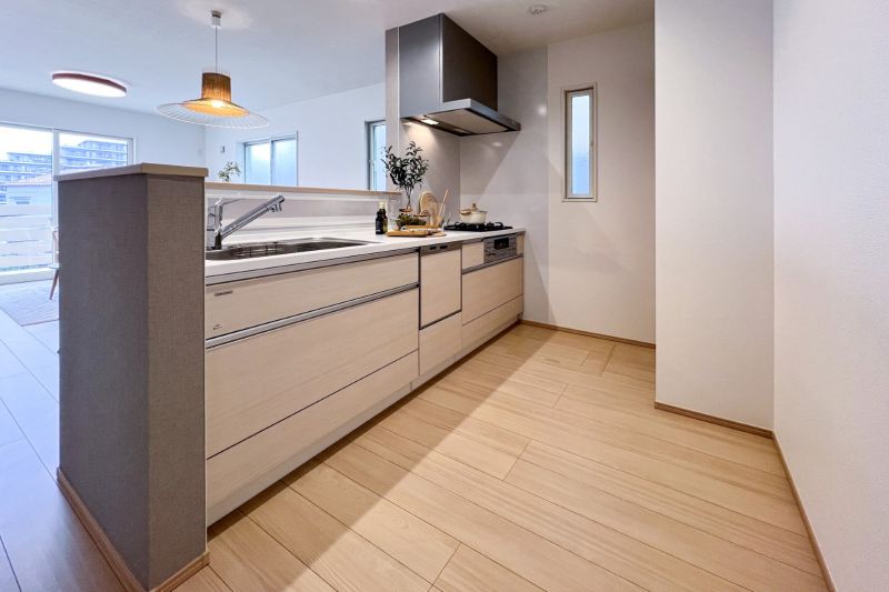 リビングが見渡せるのに、リビングからキッチンが見えにくいのも来客時便利。さらにキッチンニッチで家事もらくらく。 ※弊社施工事例
