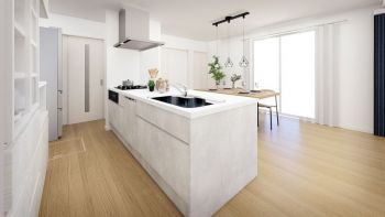 ◇開放的なキッチンは夫婦そろって調理でき、カウンターから配膳がらくらく。 ※内観完成予想図