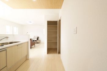 ◇注文住宅仕様の下がり天井とアクセントクロスで高級感あるキッチンでお料理できます。キッチンパントリー付きでストック用品の収納も困りません。